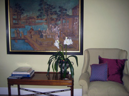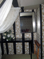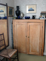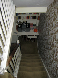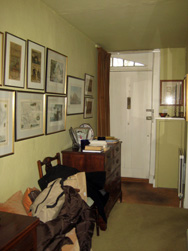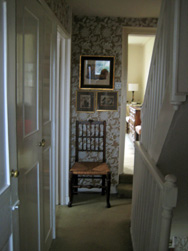 | 古い家なので廊下も階段も狭いですが壁面は長年集められてきた絵がかかっています。 廊下の正面の椅子がウェルカムな雰囲気を誘います。 |