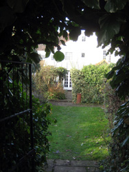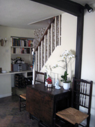 ゲートをくぐり芝生のアプローチの奥に入り口が見えます。イギリス人の家を訪ねるたびに思うことのひとつにアプローチの作り方の上手さです。どんな方が住んでいるのかしらと想像力が掻き立てられます。 | コテージの扉を開けると中は細長いホールです。古いコテージにありがちな作り方でドアを開けると中はほぼワンルーム。トリシアの家はホールの左手にリビングルーム。その奥にキッチンとダイニングが続きます。 |