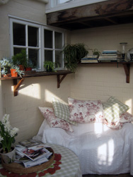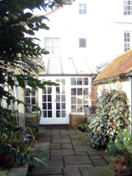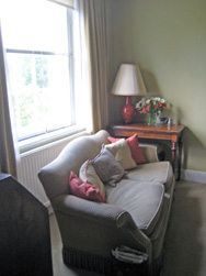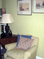 | 1階のホール左側に入ると来客用のラウンジ兼リビングルームがあります。トリシアのおじい様がエドワーディアン時代に集められた絵画が沢山飾られていました。絵画は家族から引き継ぐものだそうです。 | コーナーソファは彼女専用だそうです。クッションの組み合わせ方を見るにつけ彼女がインテリアデザイナーだということを思い出します。 | フロントガーデンに面した窓の前のソファのクッションもソファと同色中心に補色の赤を入れています。よく見るとサイドテーブルのランプベースも赤です。本当におしゃれですね。 | キッチンの外のコンサーバトリーからバックガーデンに抜けられます。ここからTenterdenの街へお買い物に出られます。 |