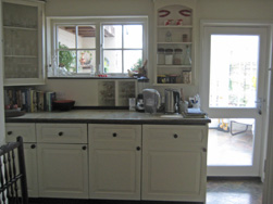 | 1階に戻ってきました。階段室の前はダイニングとキッチンです。 | 一人で動きやすい配置にシンクや食器棚が配置されています。アンのキッチンも同じでしたがお料理を楽しむ様子が伺えます。 | キッチンは南側に位置しているのでお庭へ出るドアの外にコンサーバトリーを作りました。 | 読書やお茶はコンサーバトリーの中でするのよと話してくれました。明るくて暖かい素敵な空間です。 |